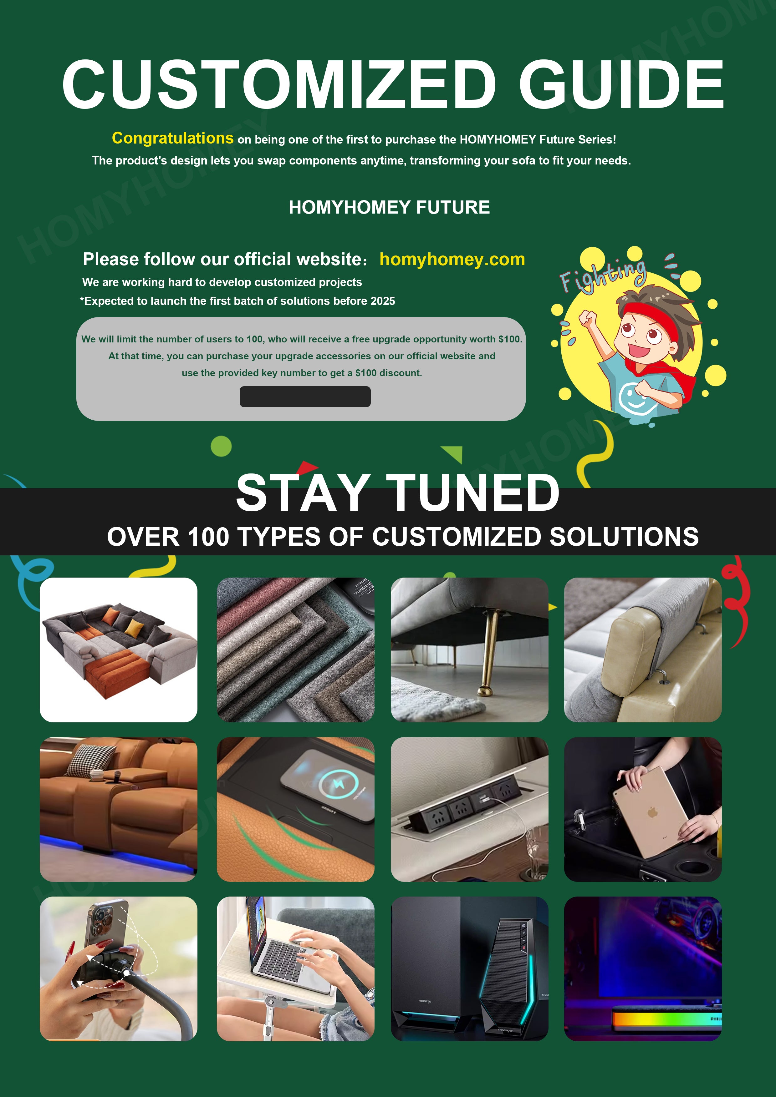 To express our gratitude to our consumers for their support and love for the HOMYHOMEY brand, we have prepared a special surprise for the lucky purchasers of the basic version of the Future Series sofa first - a mysterious discount code worth $100. This code will be randomly included in your sofa package. It recognizes you as one of our first experience officers and serves as an exclusive benefit for your future upgrade to custom services.